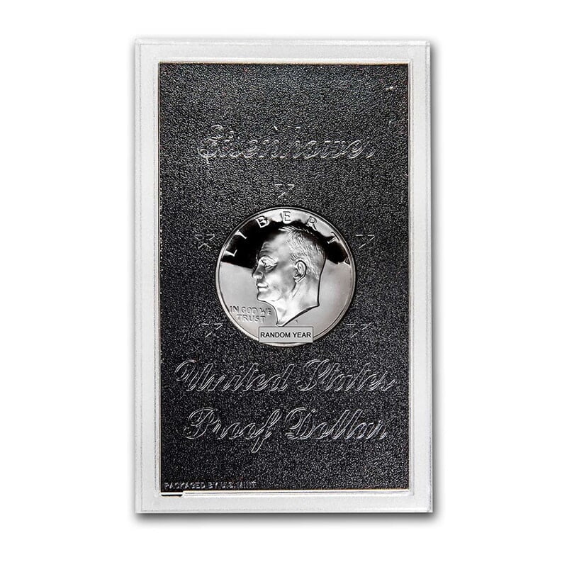 Product Description: These Eisenhower Dollars, comprised of 40% silver, were minted shortly after the passing of President Dwight D. Eisenhower. President Richard Nixon, in tribute to Eisenhower's legacy, approved legislation allowing for the production of the inaugural "Ike" Dollars, which debuted in 1971. Key Features of the Coin: - Each coin contains approximately .3161 ounces of silver. - All coins are securely enclosed in their original government-issued plastic casings. - Original woodgrain design cardboard sleeves are not included in the product. - Obverse: Showcases a powerful profile of General/President Dwight David Eisenhower facing left, with the word "LIBERTY" inscribed above his likeness. Beneath his chin is the motto "IN GOD WE TRUST," accompanied by the date positioned at the bottom of his profile. - Reverse: Displays the emblem of Apollo XI, portraying an eagle soaring over the lunar surface while clutching an olive branch in its talons. Adjacent to the eagle's flight is a miniature Earth, oriented to reveal North America. Encircling the scene are thirteen stars. Begin your own collection of American heritage by acquiring Ike Dollars. Enrich your collection today with the addition of this Proof 40% Silver Eisenhower Dollar to your cart. Please note: Due to the coins being housed in sealed cases, they are sold in their current condition and may exhibit toning, which is subject to variation based on stock availability.