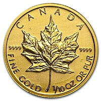 **Overview:** **Canadian Gold Maple Leaf – Timeless Beauty in Fractional Form:** Renowned for their captivating design, Canadian Gold Maple Leafs are often hailed as among the world's most exquisite Gold coins. The fractional Gold Maple Leaf coins, featuring the same iconic Maple Leaf design, serve as an ideal choice for both astute investors and passionate collectors. **Coin Highlights:** - Each coin holds 1/10 oz of .9999 fine Gold. - Individual coins are securely housed in mint plastic or protective plastic flips. - Obverse: Displays the right-facing profile of Queen Elizabeth II, accompanied by the year and face value. - Reverse: Showcases a prominent, solitary maple leaf, along with details on weight and purity. - Weight and purity assured by the Royal Canadian Mint. **Gold Canadian Maple Leaf – A Global Favorite:** Celebrated for its singular maple leaf design, stunning aesthetics, and exceptional purity, the Gold Canadian Maple Leaf remains a favored bullion coin. Secure this exceptional 1/10 oz Random Year Gold Maple Leaf to enhance your precious metals collection. **Note:** The dates you receive will be randomly chosen, based on our available stock.