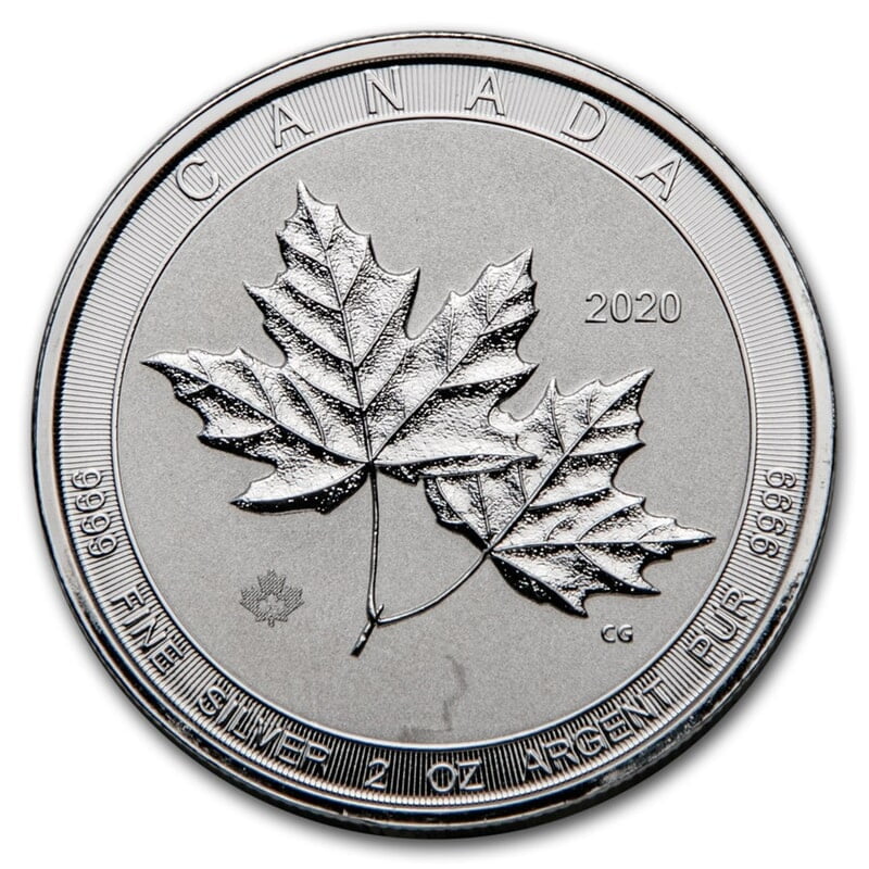 **Maple Leaf Majesty: The Canadian Twin Maple Silver Coin** This distinctive 2 oz silver coin beautifully captures Canada's diversity, stunning natural landscapes, and thriving ecology through the emblematic sugar maple leaf. Recognized as Canada's official symbol, the maple leaf represents pride, sovereignty, and beauty. As the premier producer of bullion in the nation, the Royal Canadian Mint frequently showcases the power of the maple leaf on their coins, and this unique 2 oz silver coin is no exception. On the reverse side, two maple leaves are gracefully entwined at the stem, set against the backdrop of stunning 9999 pure silver. The coin's essential details, including purity (9999), are elegantly displayed above the leaves, while a blank field surrounds the encapsulation of the nation, year of issue, metal type, and denomination. The obverse features the modern effigy of Queen Elizabeth II, accompanied by her title and the $10 denominational value. The maple leaf bullion coin stands as one of the most sought-after in the market, contributing to the Royal Canadian Mint's esteemed reputation as a global leader. Investors and collectors alike benefit from the liquidity provided by products from the Royal Canadian Mint. Seize the opportunity to enhance your wealth in ounces by adding the 2 oz Canadian Twin Maple Silver Coin to your collection today! For convenience, multiples of 14 coins will be securely packaged in a mint-issued coin tube.