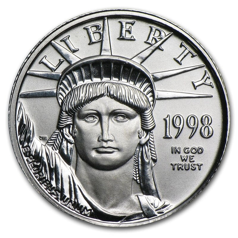 Product Description: Featuring the iconic Statue of Liberty, the sole investment-grade Platinum coin from the U.S. Mint is a standout choice. This fractional Platinum Eagle offers the same stunning craftsmanship and .9995 fine Platinum content as its full ounce counterparts but at a more accessible price. Key Features: - Contains 1/10 oz of .9995 fine Platinum. - Each coin is securely housed in protective packaging. - Obverse: Presents the powerful visage of the statue alongside the inscription "Liberty," with the year and "In God We Trust" positioned to the side. "E Pluribus Unum" is elegantly engraved along Liberty's raised arm. - Reverse: Displays an American eagle with expansive wings, soaring against the backdrop of a sunrise, with "United States of America" inscribed above. Additionally, the weight, purity, and $10 face value are depicted. - Backed by the U.S. Mint's guarantee. Enhance the presentation of your Platinum Eagle with a stylish display box, available for purchase alongside your order. Platinum Eagles seamlessly blend the allure of quality Platinum bullion with a captivating patriotic motif. Secure this 1/10 oz Platinum American Eagle coin for your collection today!