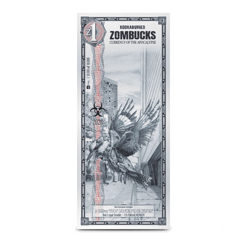 Introducing the newest addition to the Zombucks World collection, the 1 Silver Zombucks World Kookaburied Note. This unique silver note features the popular Kookaburied design from our series of copper and silver rounds, now available in a stunning silver note format. Secure your piece of apocalyptic currency today at Provident Metals. **Highlights:** - Delivered in a currency sleeve. - 2nd design in the Zombucks World Series. - Limited mintage of only 10,000 notes. - Contains 1/1000th Troy oz of .999 pure silver. - Features an undead kookaburra on the obverse side. - The reverse offers a mirrored design. Your 1 Silver Zombucks World Kookaburied Note comes individually packaged in a currency sleeve to ensure it remains in pristine condition. These notes contain a fraction of a Troy ounce of .999 pure silver, making them a valuable and unique addition to any collection. **Design:** The obverse of the 1 Zombucks World Kookaburied Note showcases the iconic undead kookaburra, a familiar sight to fans of the Zombucks series. The background of the note depicts a post-apocalyptic scene, adding depth to the design. The reverse side features a mirrored image of the obverse, maintaining consistency across the note’s design. Despite its thin nature, this silver note offers intricate detailing and quality craftsmanship.