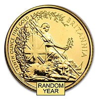 **Product Overview:** **Exquisite Gold Britannia – A Royal Masterpiece:** Crafted by the esteemed Royal Mint, the Gold Britannia stands as one of the most captivating coins in the market. The 1/10 oz Gold Britannia, with a face value of £10, holds the distinction of being legal British tender. **Coin Highlights:** - Contains 1/10 oz of fine Gold. - Purity may fluctuate based on the year of issue, yet each coin guarantees 1/10 oz actual Gold weight. - Obverse: Showcases a regal effigy of Queen Elizabeth II. - Reverse: Features an iconic portrayal of Britannia, the legendary figure. - Guaranteed by the British government. **Acquire Your 1/10 oz Gold Britannia Today:** Enhance your collection with the timeless elegance of the 1/10 oz Gold Britannia. As a legal British tender with a face value of £10, this coin is a testament to the Royal Mint's commitment to excellence. **Note:** The selection of dates and conditions for these random-year coins is at our discretion, ensuring the availability of stock.