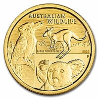 **Product Details** Celebrate the diverse wildlife of the Outback with the special 2022-P 1/4 oz Gold coin! This stunning BU (Brilliant Uncirculated) coin showcases the iconic koala, kookaburra, and kangaroo, making it a unique addition to your collection. Act fast, as this coin has a limited release of just 1,000 coins! **Coin Highlights:** - Contains 1/4 oz of .9999 fine Gold. - Limited mintage of only 1,000 coins, adding to its exclusivity. - Individual coins come securely packaged in protective packaging. - Obverse: Features the Ian Rank-Broadley likeness of Queen Elizabeth II, along with the coin’s monetary denomination. - Reverse: Showcases captivating depictions of the Australian koala, kookaburra, and kangaroo. Includes essential details such as the date, weight, and purity. - Sovereign coin backed by the Australian government. Don't miss the opportunity to add this beautiful 1/4 oz Gold coin to your collection. Purchase yours today!