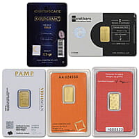 **BAR HIGHLIGHTS:** - All bars contain .0803 oz of .999+ fine Gold. - Each bar is enclosed in an assay card and sealed in tamper-evident proof packaging. - The obverse of each bar will differ depending on the brand received. - The reverse of each bar will differ depending on the brand received. - Bars may or may not be sourced from the secondary market. This listing features Gold Bars from various manufacturers, each with distinct designs, ranging from old to new. Consequently, we are able to offer these bars at our lowest prices for 2.5g Gold Bars across the entire site! The designs and manufacturers of the bars you receive are determined by our current inventory. When ordering multiple bars, you may or may not receive a combination of designs or manufacturers. The possibility exists to receive either all old or all new bars.