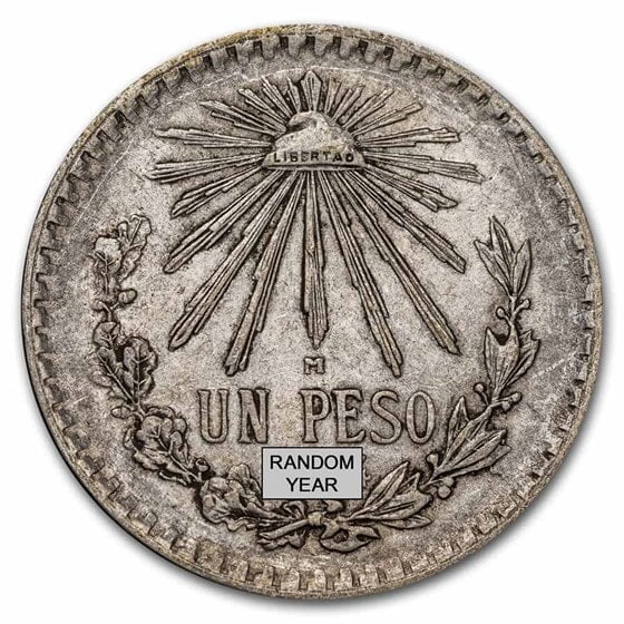 **Product Details** Explore the rich history of Mexican numismatics with these vintage Pesos, representing the final issues featuring the iconic cap-and-ray motif. Each coin, with a weight of 16.66 grams of .720 fine Silver, contains .3856 oz of pure Silver. **Coin Highlights:** - Contains .3856 oz Silver, equivalent to 16.66 grams of .720 fine Silver. - Coins will be presented in protective packaging, and dates will be selected by us. - Obverse: Showcases the Mexican coat of arms portraying a golden eagle perched atop a cactus, devouring a snake. - Reverse: Features a radiant Phrygian cap with the inscription "LIBERTAD" above a wreath of oak and laurel. Denomination, date, and 'M' mint mark are positioned below. - Produced by Banco de Mexico from 1920-1945. These timeless Pesos offer a glimpse into the fascinating history of Mexican coinage, allowing you to add a touch of nostalgia to your Precious Metals collection at relatively modest premiums. Add one, or more, to your collection today!