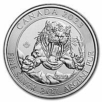 **Product Details:** Introducing the inaugural release from the Royal Canadian Mint's Ice Age series, showcasing the formidable sabre-tooth cat! **Coin Highlights:** - Contains 2 oz of .9999 fine Silver. - Individual coins are delivered in protective packaging, with multiples of 14 housed in plastic mint tubes, and multiples of 280 packaged in Monster Boxes. - Eligible for Precious Metals IRAs. - Obverse: The effigy of Queen Elizabeth II by Susanna Blunt is featured on the obverse. This side also boasts a special marking with four pearls, representing the four effigies that have adorned Canadian coins, along with the double date of her reign. - Reverse: Showcasing a compelling sabre-tooth tiger design, the reverse captures the tiger leaping forward with an open jaw. The artwork is credited to Julius Csotonyi, a Canadian-based paleoartist. A micro-engraving security feature next to the design includes a maple leaf and the number 23, corresponding to the year of release. - Guaranteed by the Royal Canadian Mint. Add this captivating 2 oz Silver Smilodon Sabre-tooth Cat coin to your collection today! **About the Smilodon Sabre-Tooth Cat:** Renowned as the most iconic predator of the prehistoric Ice Age, the Smilodon fatalis, or sabre-tooth cat, strikes fear with its oversized fangs. The name "Smilodon" translates to "scalpel tooth," a fitting moniker for this ancient big cat with canines measuring up to 18 centimeters long. As a top predator, the sabre-toothed cat hunted large herbivores such as horses, camels, and giant ground sloths by stealthily stalking and pouncing on them. Contrary to its association with glaciers, the sabre-tooth cat favored warmer climates. Fossil discoveries indicate its widespread presence in ice-free regions across North, Central, and South America. In 2019, a bone dating back 35,000 to 40,000 years provided the first verified evidence of Smilodon fatalis in the prehistoric plains of southern Alberta. The species became extinct around 11,700 years ago at the conclusion of the Pleistocene epoch. **The Royal Canadian Mint Silver Coins:** The Royal Canadian Mint is renowned for producing some of the world's most sought-after Silver coins, including the iconic Silver Maple Leaf. Striking over 1 billion coins annually, the mint contributes to the rich numismatic heritage with vintage Canadian coins and currencies for various nations. Royal Canadian Mint Silver bullion offers an attractive avenue for acquiring Silver, combining Precious Metal content with iconic designs.